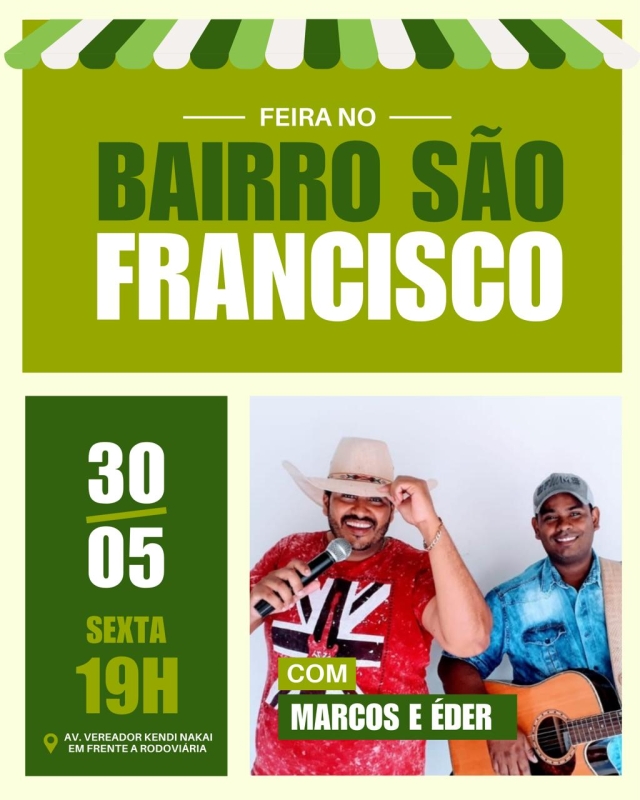 Além das delícias gastronômicas, a feira contará com um show musical ao vivo da dupla costarriquense Marcos & Éder. O ambiente acolhedor proporcionará um espaço de convivência entre os moradores, fortalecendo os laços comunitários e estimulando a economia local. Traga sua família e amigos e venha prestigiar essa celebração do Bairro São Francisco e adjacências!