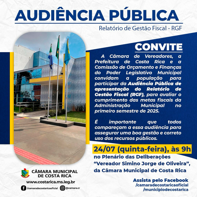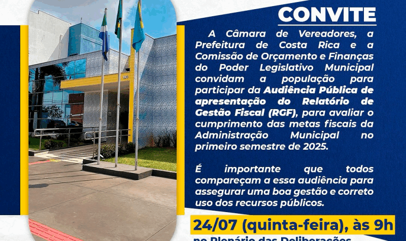 Nesta quinta-feira, 24 de julho de 2025, às 9h, a Câmara Municipal de Costa Rica/MS realizará uma Audiência Pública no Plenário das Deliberações “Vereador Simino Jorge de Oliveira”. O foco da reunião será a apresentação do Relatório de Gestão Fiscal (RGF) referente ao primeiro semestre do ano. Este evento é crucial para avaliar o cumprimento das metas fiscais da Administração Municipal e promover a transparência na utilização dos recursos públicos.