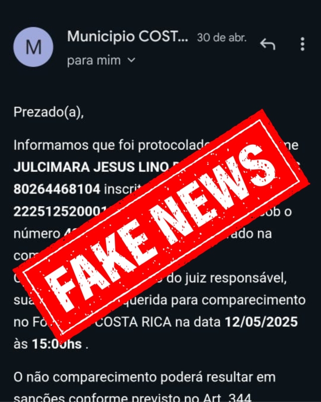 A Prefeitura de Costa Rica, por meio da Procuradoria-Geral do Município, alerta a população sobre a circulação de uma notificação falsa recebida por cidadãos costarriquenses através de e-mail. Esta notificação, a exemplo, que se apresenta como uma intimação oficial em nome de JULCIMARA JESUS LINO DA CUNHA MORAES, é um golpe!
