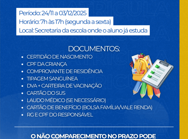 O período de rematrícula é destinado aos alunos que já estão matriculados na rede municipal. Para garantir a permanência na instituição, os responsáveis devem comparecer à secretaria da escola onde a criança estuda. O prazo para rematrículas é de 24 de novembro a 3 de dezembro de 2025, com atendimento das 7h às 17h, de segunda a sexta-feira.