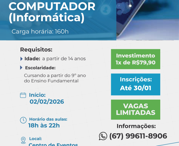 O curso terá carga horária de 160 horas, com duração aproximada de dois meses. As aulas começam no dia 2 de fevereiro de 2026 e serão realizadas de segunda a sexta-feira, das 18h às 22h, no Centro de Eventos Ramez Tebet. O investimento é de apenas uma parcela de R$ 79,90.