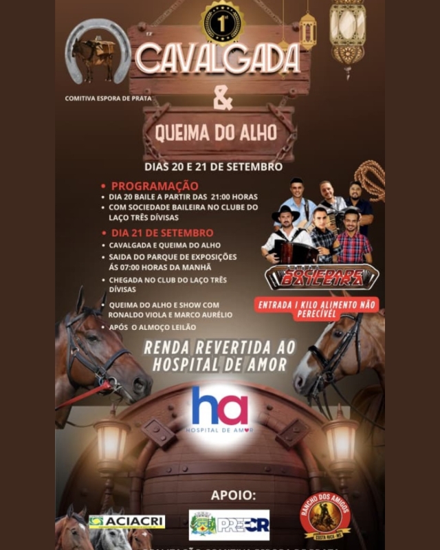 Com o apoio da Prefeitura de Costa Rica, por meio da Secretaria de Esporte e Cultura, a Comitiva Espora de Prata realizará baile, cavalgada e queima do alho nos dias 20 e 21 de setembro de 2025. O evento, que reunirá a comunidade, terá como objetivo arrecadar fundos para o Hospital de Amor de Barretos/SP, uma instituição vital no tratamento do câncer.