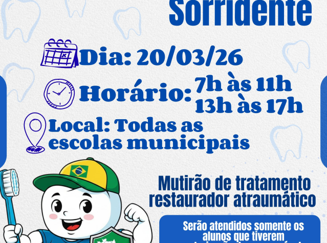 A Prefeitura de Costa Rica, por meio da Secretaria de Saúde (SMS) e de Educação (SEMED), realiza nesta sexta-feira, 20 de março de 2026, o “Dia B – Brasil Sorridente”. A ação acontece em todas as escolas municipais, nos períodos das 7h às 11h e das 13h às 17h, com a realização de um mutirão de tratamento restaurador atraumático. O atendimento será destinado exclusivamente aos alunos que apresentarem autorização dos responsáveis.