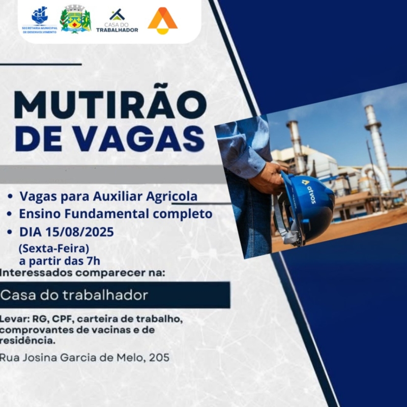 Nesta sexta-feira, 15 de agosto de 2025, Costa Rica sediará mais um Mutirão de Vagas para Auxiliares Agrícolas, na Casa do Trabalhador. O evento é promovido pela usina Atvos e organizado pela Secretaria de Desenvolvimento via Casa do Trabalhador, com o objetivo de recrutar novos trabalhadores para reposição de equipe.