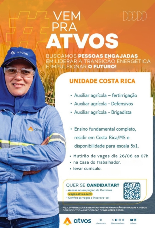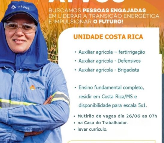 Nesta quinta-feira, 26 de junho de 2025, Costa Rica realiza mais um Mutirão de Vagas para Auxiliares Agrícolas de Fertirrigação, de Defensivos e Brigadista na Casa do Trabalhador, promovido pela usina Atvos e organizado pela Secretaria de Desenvolvimento. O evento visa recrutar novos trabalhadores para aumentar a equipe.