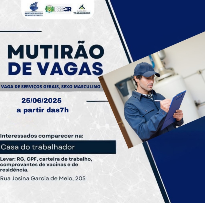 Nesta quarta-feira, 25 de junho de 2025, Costa Rica realiza mais um Mutirão de Vagas para Serviços Gerais na Casa do Trabalhador, promovido por uma usina local e organizado pela Secretaria de Desenvolvimento. O evento visa recrutar novos trabalhadores para aumentar a equipe.