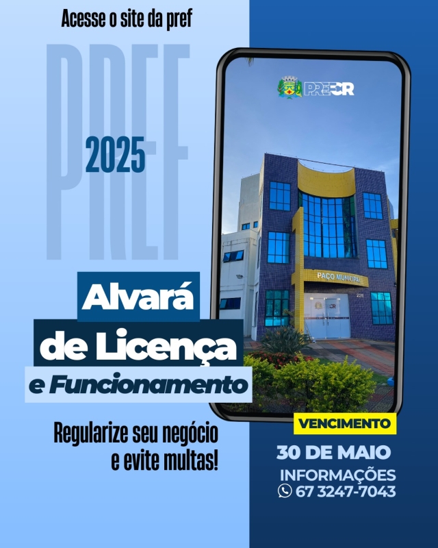 O Município de Costa Rica, por meio da Secretaria de Administração, Finanças, Planejamento, Receita e Controle, alerta os contribuintes sobre o prazo para o pagamento da taxa do Alvará de Licença e Funcionamento referente ao exercício de 2025. A data limite para regularização é na próxima sexta-feira, 30 de maio de 2025. Essa taxa é obrigatória para todas as empresas e profissionais autônomos que atuam na cidade, exceto àquelas que enquadraram na Lei de Liberdade Econômica (Lei nº 13.874/2019).