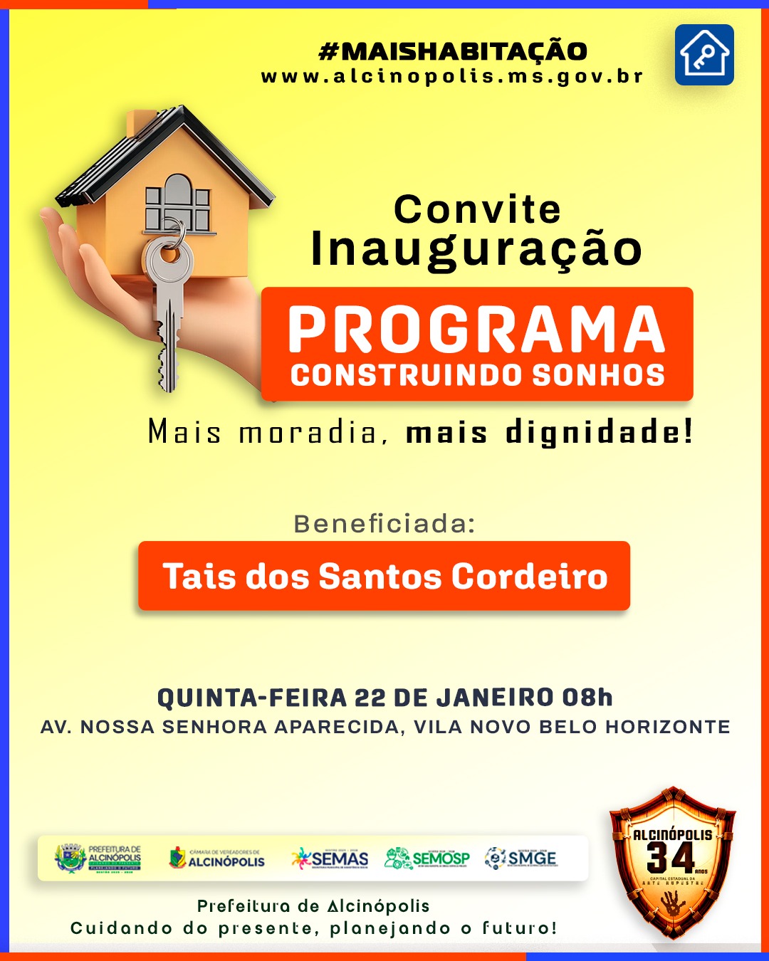 A Prefeitura de Alcinópolis realiza na próxima quinta-feira, 22 de janeiro de 2026, às 08h, no Distrito de Vila Novo Belo Horizonte a entrega de mais unidade habitacional por meio do programa Construindo Sonhos, iniciativa que tem como objetivo garantir moradia digna às famílias do município.