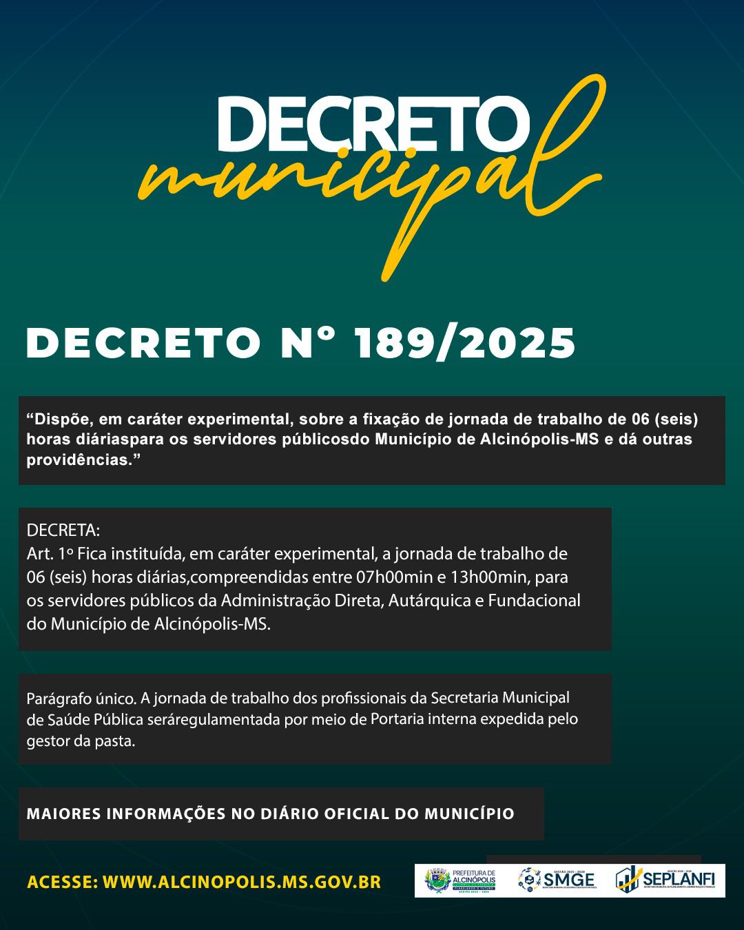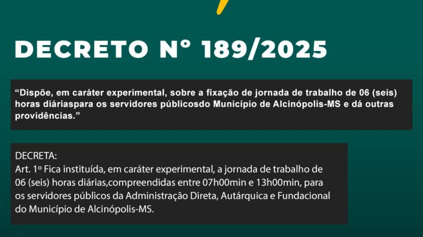 A Prefeitura de Alcinópolis, anunciou a implementação de uma jornada de trabalho experimental de seis horas diárias para os servidores públicos do município, conforme o Decreto nº 189/2025, publicado em 5 de setembro de 2025. A medida, que se destina a aprimorar a gestão de pessoas e promover o bem-estar e a produtividade dos servidores, estabelece que a nova carga horária será válida para a Administração Direta, Autárquica e Fundacional do município.