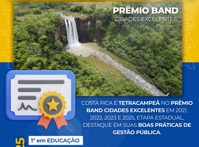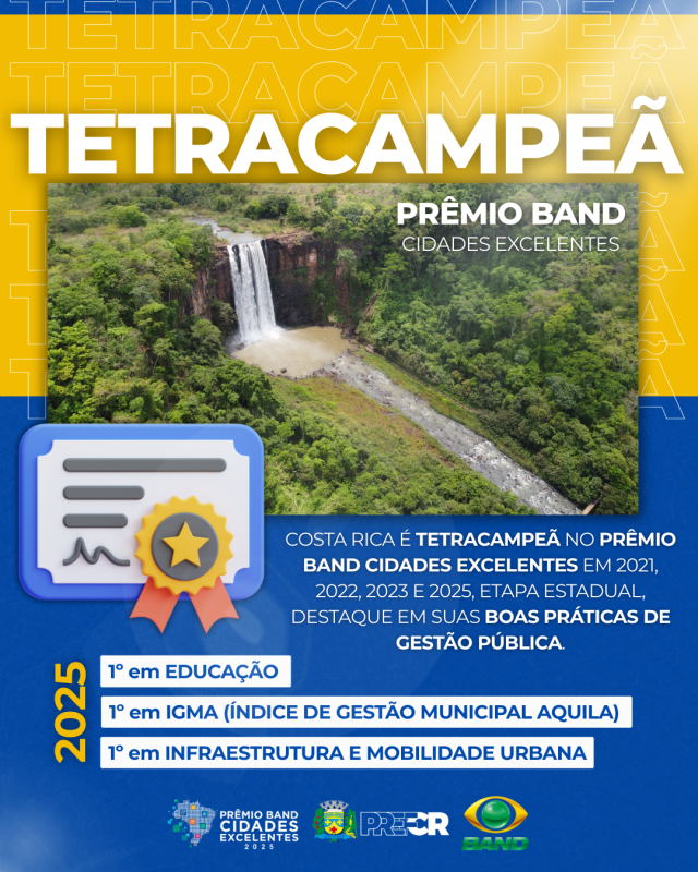A cidade com 28.740 habitantes foi premiada quatro vezes na categoria de municípios com até 30 mil habitantes, destacando-se no Índice de Gestão Municipal Aquila (IGMA), que avalia a eficiência e a qualidade dos serviços públicos. Em 2025, Costa Rica se sagrou tetracampeã no algoritmo de consolidação final e foi finalista nas categorias de Educação e Infraestrutura e Mobilidade Urbana, evidenciando a sinergia entre o fomento ao empreendedorismo e os investimentos em saúde, educação e infraestrutura.