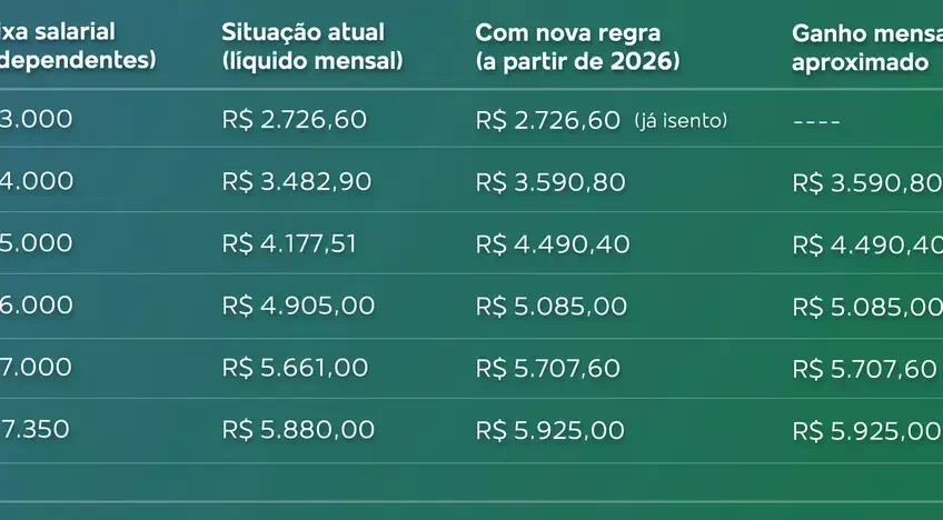 Mudança é um redutor – Diferente de uma simples atualização das faixas salariais, a nova política usa um redutor aplicado sobre o imposto apurado. Assim, quem ganha até R$ 5 mil fica totalmente livre da tributação, e quem ultrapassa esse valor terá alívio proporcional.